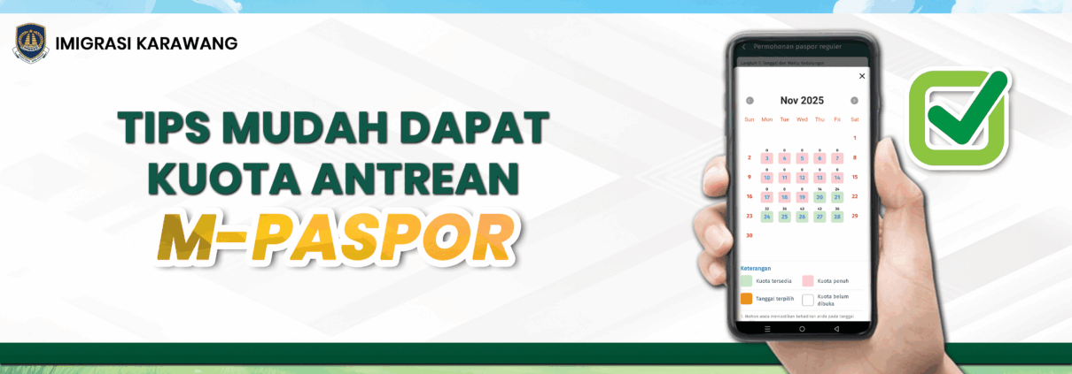 Kuota antrean online di Kantor Imigrasi Kelas I Non TPI Karawang akan dibuka di Aplikasi M-Paspor pada hari kerja terakhir di setiap bulannya. Catat waktunya agar kamu tidak tertinggal informasi pembukaan kuota selanjutnya.