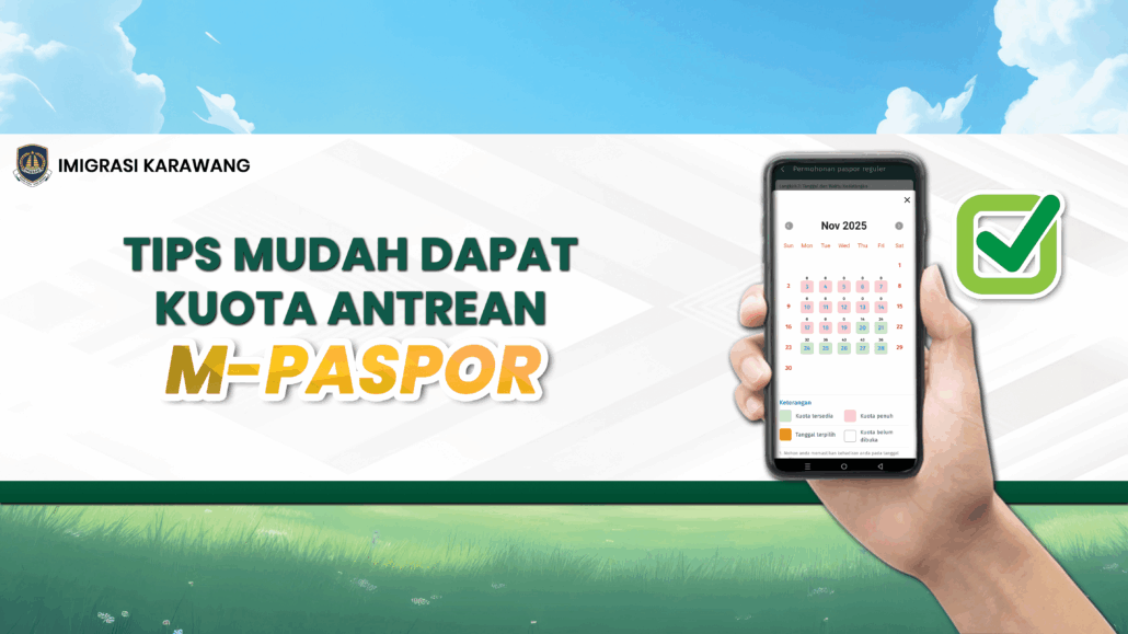 Kuota antrean online di Kantor Imigrasi Kelas I Non TPI Karawang akan dibuka di Aplikasi M-Paspor pada hari kerja terakhir di setiap bulannya. Catat waktunya agar kamu tidak tertinggal informasi pembukaan kuota selanjutnya.